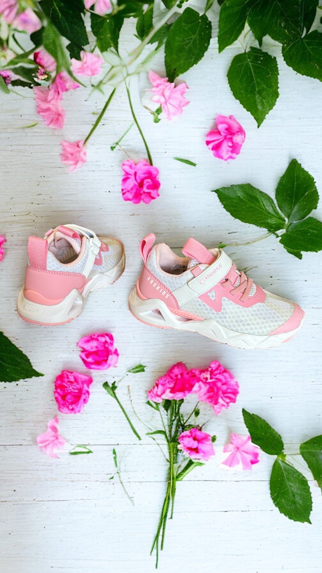 Buty zapinane są na rzep oraz dodatkowe gumeczki, co ułatwia zakładanie i zdejmowanie, a także zapewnia pewne dopasowanie do stopy. Różowe akcenty dodają im dziewczęcego uroku, a białe elementy nadają świeżości i lekkości.