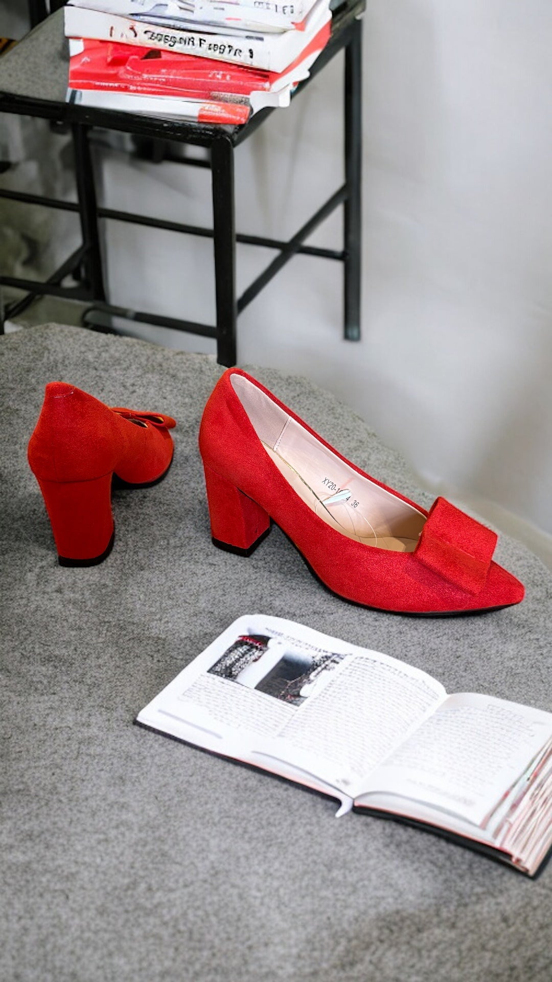 Czółenka wykonane z wysokiej jakości zamszu w intensywnym czerwonym kolorze, który przyciąga wzrok i dodaje charakteru każdej stylizacji. Stabilny obcas zapewnia wygodę noszenia przez dłuższy czas, a jednocześnie dodaje sylwetce smukłości. Ozdobna kokarda umieszczona na przodzie buta stanowi subtelny, ale efektowny detal, który nadaje im szyku i elegancji. Idealne na różne okazje – od formalnych spotkań, przez wesela, po codzienne wyjścia.