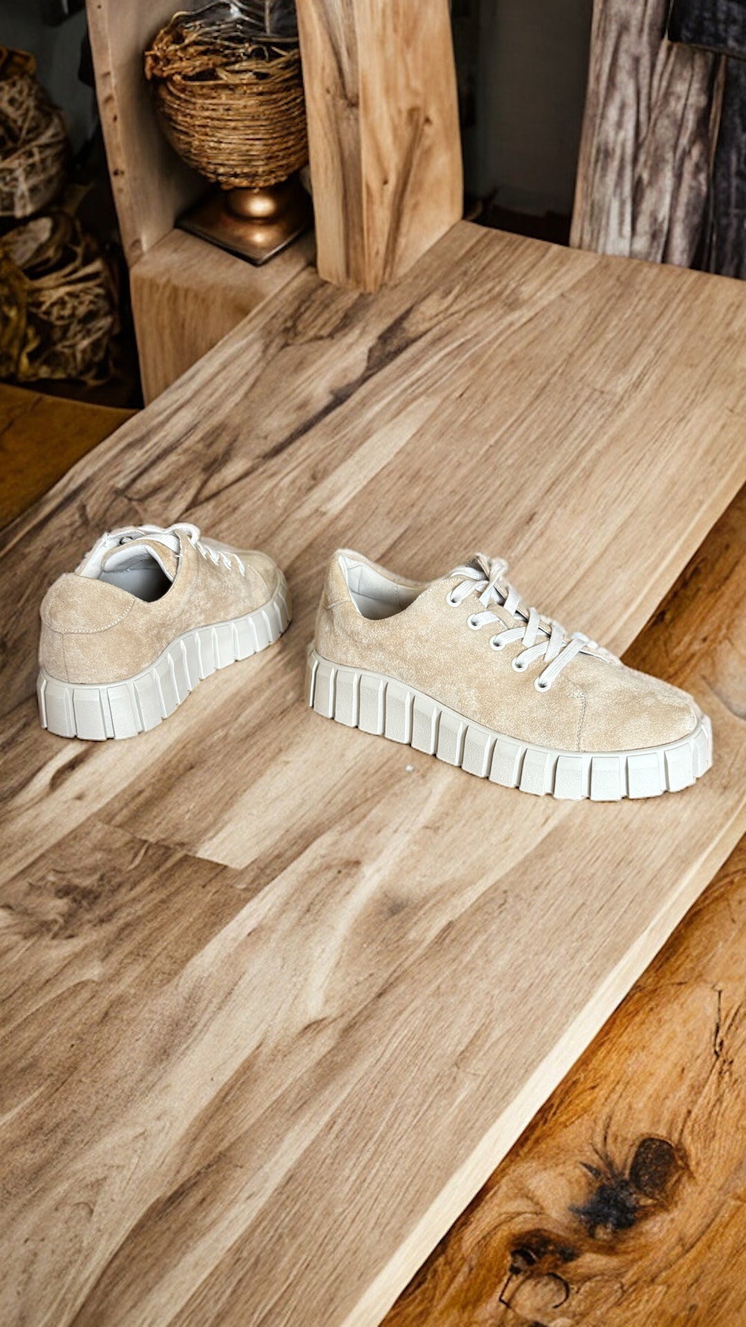 Obuwie damskie firmy Potocki w wersji sportowej, wykonane z zamszu w kolorze beżowym, charakteryzuje się eleganckim, a jednocześnie casualowym stylem, idealnym na co dzień.