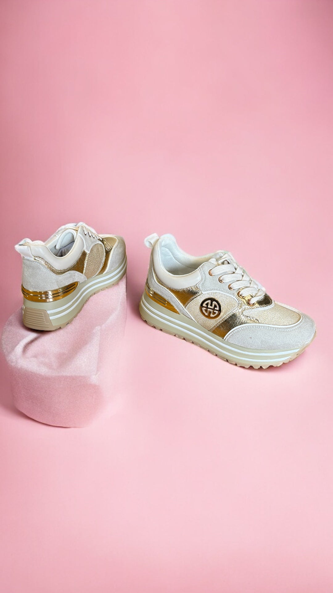 Obuwie białe na wyższej podeszwie ze złotymi wstawkami, wiązane na sznurówki ze skaju, to modny i stylowy wybór, który łączy w sobie elegancję i wygodę.