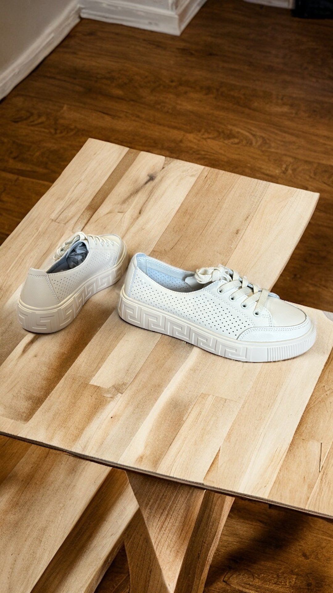 Te tenisówki charakteryzują się modnym, beżowym kolorem, który pasuje do wielu stylizacji. Wykonane są z tworzywa skóropodobnego, co sprawia, że są nie tylko estetyczne, ale także łatwe w pielęgnacji. Dziurkowana cholewka zapewnia odpowiednią wentylację, co jest szczególnie ważne w cieplejsze dni. Wnętrze butów wyłożone jest skórzaną wkładką, co zwiększa komfort noszenia i pozwala stopom oddychać.